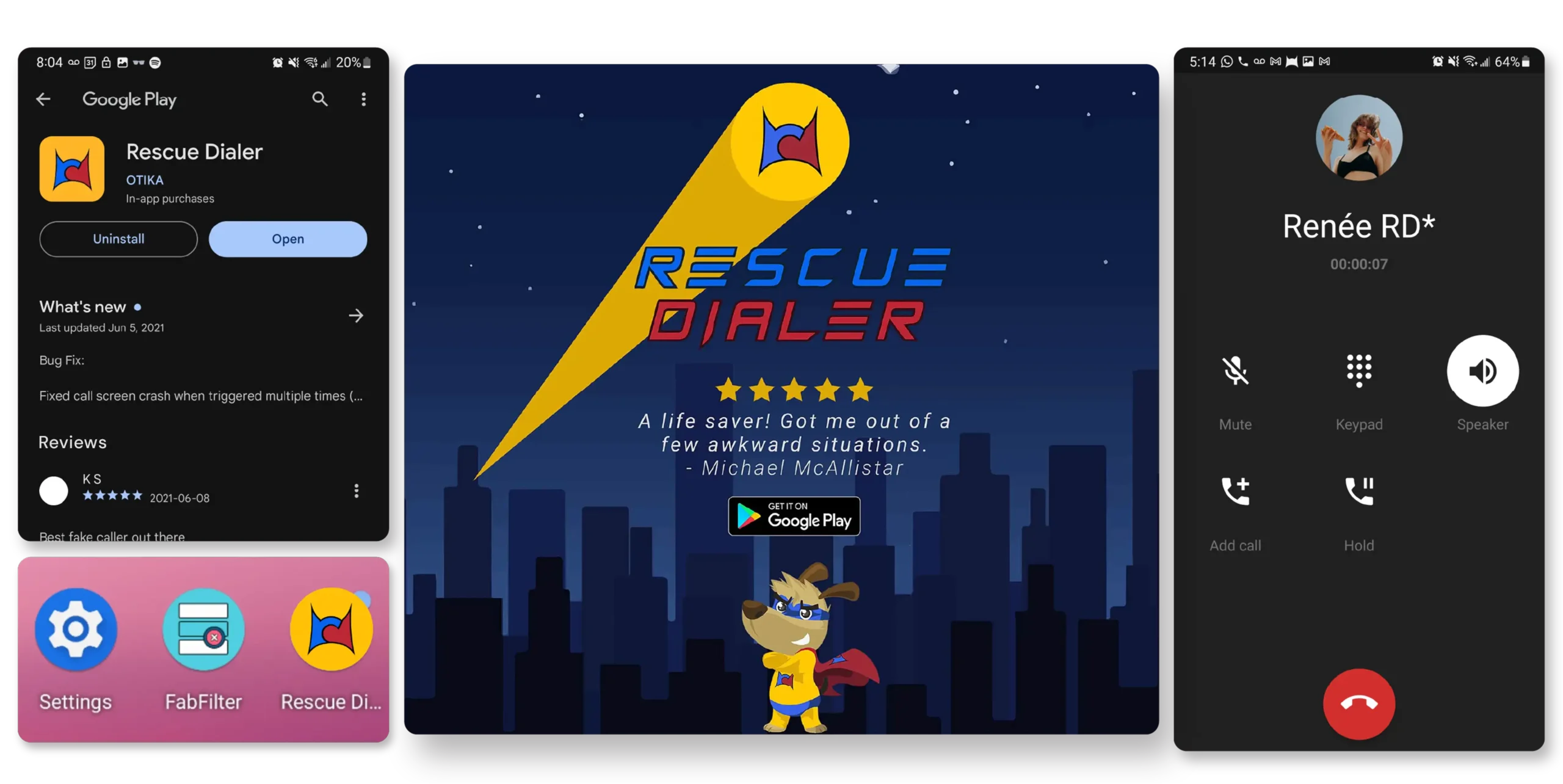 Rescue Dialer is an innovative app designed to help users slyly remove themselves from challenging social situations. Have you ever been stuck in a conversation or situation and wished someone would call you? Have you gone as far as to text a friend to call you? You’re not alone and you’ll never be stuck in that situation again. Rescue dialer started as a concept and quickly transformed it’s vision into an executable reality for mobile users.